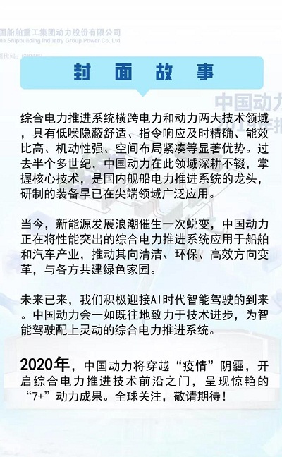 4月29日,就在今天 中國船舶集團旗下中國動力 2019年報重磅發布 ? ? 讀取報告全文 歡迎點擊“閱讀報告” 或長按識別下方二維碼 2020年,中國動力將穿越疫情陰霾 開啟綜合電力推進技術前沿之門 呈現驚艷的“7+”動力成果 全球關注,敬請期待!
