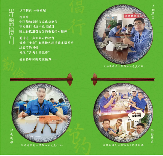 中國船舶集團多家成員單位積極踐行習(xí)近平總書記關(guān)于制止餐飲浪費行為的重要指示精神,通過進一步加強宣傳教育,鼓勵“光盤”和其他各項措施多措并舉,培養(yǎng)節(jié)約習(xí)慣,杜絕“舌尖上的浪費”,請看各單位的光盤接力。