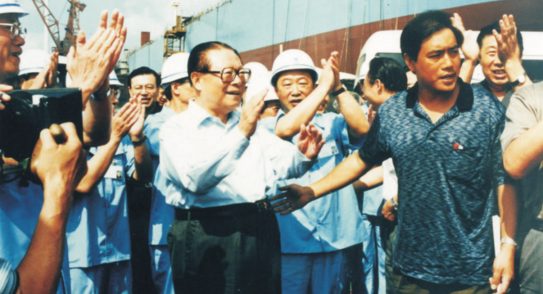1994年4月29日,江澤民同志在視察江南造船時看望工人。