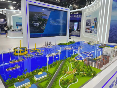 # 10萬噸級大型深遠海養殖工船、2000噸自升自航式風電安裝平臺、耕海一號二期工程等模型以及“藍色海洋經濟綜合體”沙盤,生動展示出“深海養殖+海上文旅+海上風電”互聯互通的繁榮業態景象;