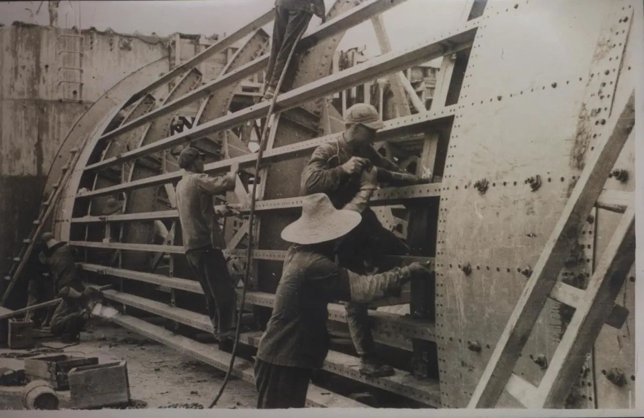 1934年武漢,上世紀(jì)30年代,武昌造船成立之初,工人們以手工作業(yè)“敲敲打打”形式開(kāi)展修造船業(yè)務(wù)。修造的船只大多為100~300噸、鋼肋骨與木殼結(jié)構(gòu),僅有少量是鋼鉚接船體。建造的船只只能在長(zhǎng)江上航行跑跑運(yùn)輸。為了生存和救國(guó),船廠(chǎng)還建造一些農(nóng)用機(jī)械器具、槍支,以輔助民生、支援抗日。