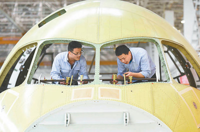 中航工業成飛公司工人在進行C919駕駛艙風擋裝配操作。新華社記者 劉 坤攝