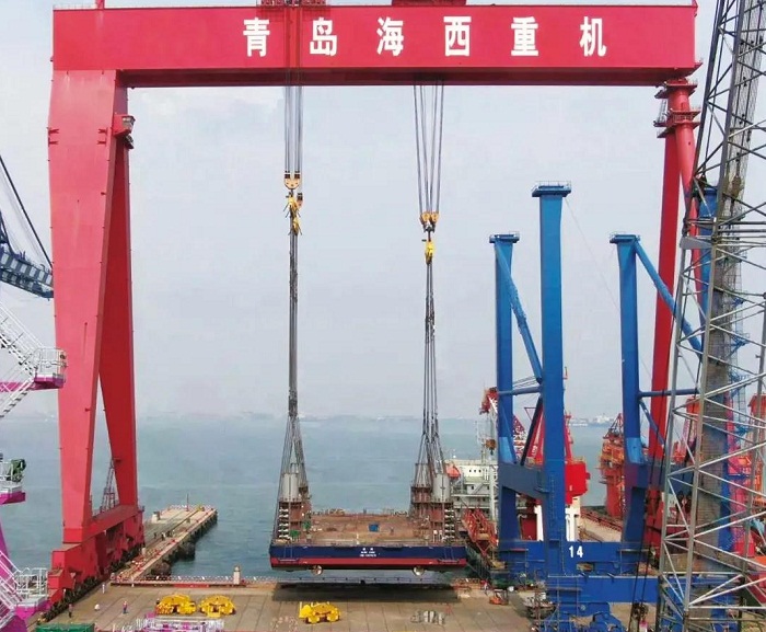 ????在該項目的前期建造策劃階段,海西重機沒有采用常規(guī)船塢下水或滑移下水方式,而是大膽提出利用1600噸龍門吊整體吊裝下水的設想。經(jīng)過一系列重量預估及方案論證,最終核定吊裝下水重量接近1440噸。