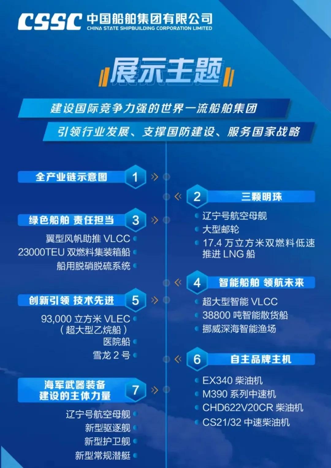 總體展區(qū) 中國船舶集團(tuán)展示了代表著世界造船工業(yè)最高水平的航空母艦、大型郵輪、液化天然氣(LNG)船“皇冠上的三顆明珠”,充分彰顯具備設(shè)計(jì)建造符合全球船級(jí)社規(guī)范、滿足國際通用技術(shù)標(biāo)準(zhǔn)和安全公約要求的產(chǎn)品的能力。圍繞“綠色 智能 創(chuàng)新”主題,特別設(shè)置了3個(gè)主題展臺(tái),重點(diǎn)展示23000TEU雙燃料集裝箱船、超大型智能超大型油船(VLCC)、挪威深海智能漁場、9.8萬立方米超大型乙烷運(yùn)輸船(VLEC)、“雪龍2”號(hào)等9型產(chǎn)品,彰顯出中國船舶集團(tuán)貫徹落實(shí)“創(chuàng)新、協(xié)調(diào)、綠色、開放、共享”新發(fā)展理念的實(shí)踐。