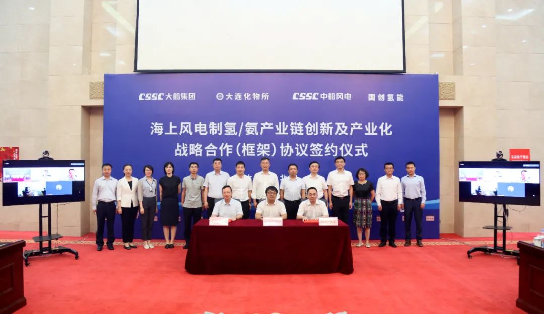 8月6日,中國船舶集團旗下大船集團舉行《海上風電制氫/氨產業(yè)鏈創(chuàng)新及產業(yè)化戰(zhàn)略合作(框架)協(xié)議》簽約儀式。大船集團與大連化物所、國創(chuàng)氫能、中船風電四方代表在協(xié)議書上簽字。