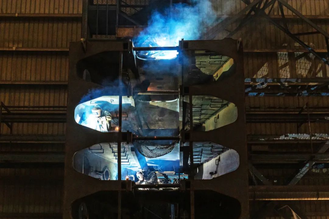 大船集團全體干部職工統一思想,凝心聚力,堅守本職擔當,積極主動作為,爭分奪秒,奮力沖刺。其中FPSO-8項目是大船集團建造的第七艘FPSO。今年以來,FPSO-8項目提前計劃節點,順利實現鋪底,并完成了連續六個總段的塢內合攏。