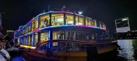 “廣游19”配置3015kWh純鋰電池驅(qū)動,Z形全回轉舵槳推進,經(jīng)濟航速下可滿足7小時續(xù)航要求。船體上建采用大面積玻璃幕墻,具有開闊的觀光視野,可360度觀賞珠江日景夜景,可提供江景游覽、娛樂餐飲、會議招待、婚禮、音樂舞會、年會等綜合服務。