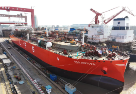 2月15日,在4號(hào)塢率先出塢的是江南造船為廣東九豐能源集團(tuán)有限公司建造的國(guó)內(nèi)首制79800立方米Mark III型薄膜式液化天然氣(LNG)運(yùn)輸船,以及為天津西南海運(yùn)有限公司建造的93000立方米超大型液化氣船(VLGC)首制船;同時(shí)起浮的還有93000立方米VLGC后續(xù)半船和即將移位至3號(hào)塢的24100TEU超大型集裝箱船的艏部巨型環(huán)段。同批次的后續(xù)作業(yè)將轉(zhuǎn)移到3號(hào)塢,預(yù)計(jì)在2月24日,江南造船為地中海航運(yùn)(MSC)建造的24100TEU超大型集裝箱船系列第二艘(H2733船)以及為新加坡Petredec公司建造的93000立方米VLGC系列第二艘(H2736船)出塢,后續(xù)兩艘半船同步起浮。