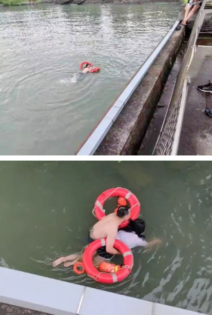 就在此時,韭菜港公園保安戴金堂,將綁有繩索的救生圈拋至水中,眭才俊立即托著女子扶上救生圈,竭盡全力游向岸邊。