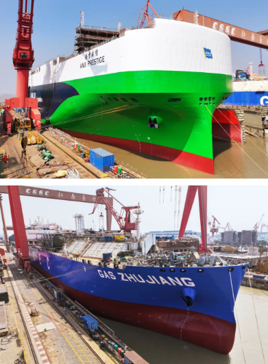 8月11日,中國船舶集團(tuán)旗下江南造船4號(hào)船塢迎來一艘99000立方米超大型乙烷乙烯運(yùn)輸船(VLEC)和一艘7800車位汽車運(yùn)輸船(PCTC)出塢 ,一艘99000立方米VLEC半船和一艘7800車位PCTC半船同步起浮,達(dá)成了“PV同步”建造模式的首批次出塢。