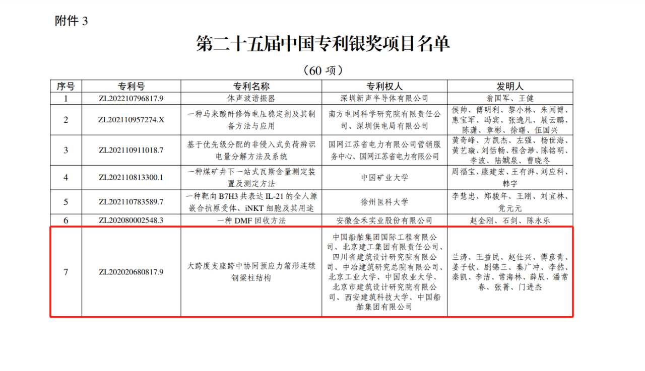 今年6月,國家知識產(chǎn)權局公布第二十五屆中國專利獎授獎決定,由中船集團旗下中船國際工程主導申報的專利《大跨度支座跨中協(xié)同預應力箱形連續(xù)鋼梁柱結構》(專利號:ZL202020680817.9)榮獲本屆中國專利銀獎。該獎項由國家知識產(chǎn)權局與世界知識產(chǎn)權組織聯(lián)合設立,是我國專利領域的最高榮譽。今天,讓我們走進中船國際工程鋼結構工程設計與研發(fā)團隊,聆聽他們的奮斗故事。
