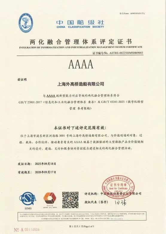 后續(xù),外高橋造船將持續(xù)發(fā)揮4A級貫標(biāo)體系的引領(lǐng)作用,深化新一代信息技術(shù)與船舶制造融合應(yīng)用,積極建設(shè)具有先進代表性的新一代智能船廠,為船海事業(yè)高質(zhì)量發(fā)展注入智慧力量。