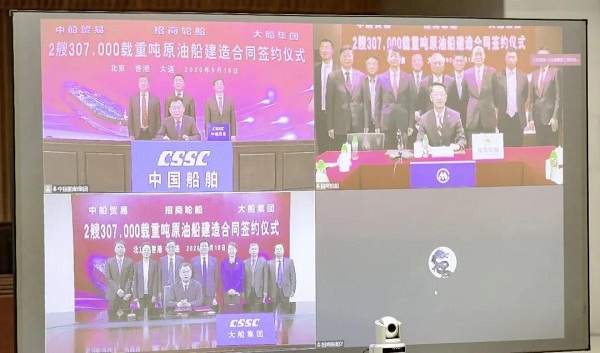 ????5月18日,中國(guó)船舶集團(tuán)旗下大船集團(tuán)、中船貿(mào)易與招商局集團(tuán)旗下招商輪船在北京、大連、香港三地以“云簽約”方式簽署2艘30.7萬(wàn)載重噸原油船建造合同。中國(guó)船舶集團(tuán)副總經(jīng)理孫偉、招商局集團(tuán)副總經(jīng)理王宏、招商輪船董事長(zhǎng)謝春林出席簽約儀式,中船貿(mào)易董事長(zhǎng)李洪濤、大船集團(tuán)總經(jīng)理?xiàng)钪局摇⒄猩梯喆偨?jīng)理王永新代表各方在建造合同上簽字。