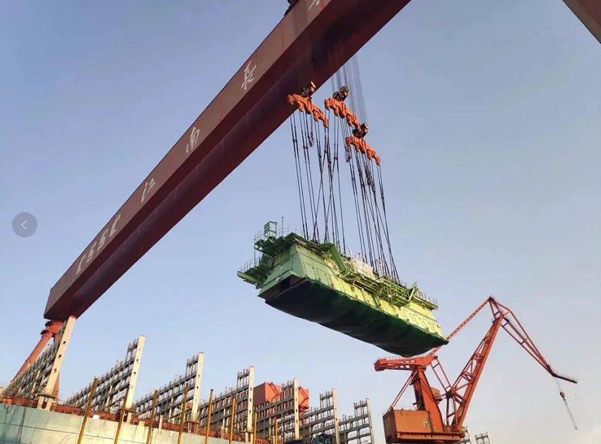 ????日前,中國船舶集團(tuán)旗下滬東中華順利完成23000TEU集裝箱船3號船的主機吊裝工作,標(biāo)志著該船向出塢邁出最關(guān)鍵一步。主機吊裝整個過程用時不到5天,同時取得僅用2.5天就完成5大件吊裝的新突破,為同行業(yè)系列船最短紀(jì)錄。