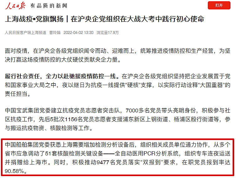 “中國船舶集團(tuán)黨組獲悉上海需要增加檢測分析設(shè)備后,組織相關(guān)成員單位通力協(xié)作,從多個省市應(yīng)急調(diào)動了51套核酸檢測關(guān)鍵設(shè)備——全自動醫(yī)用PCR分析系統(tǒng),組織專車連夜運送并捐贈給上海市。同時,積極推動9477名黨員落實‘雙報到’要求,在職黨員報到率達(dá)90.58%。”