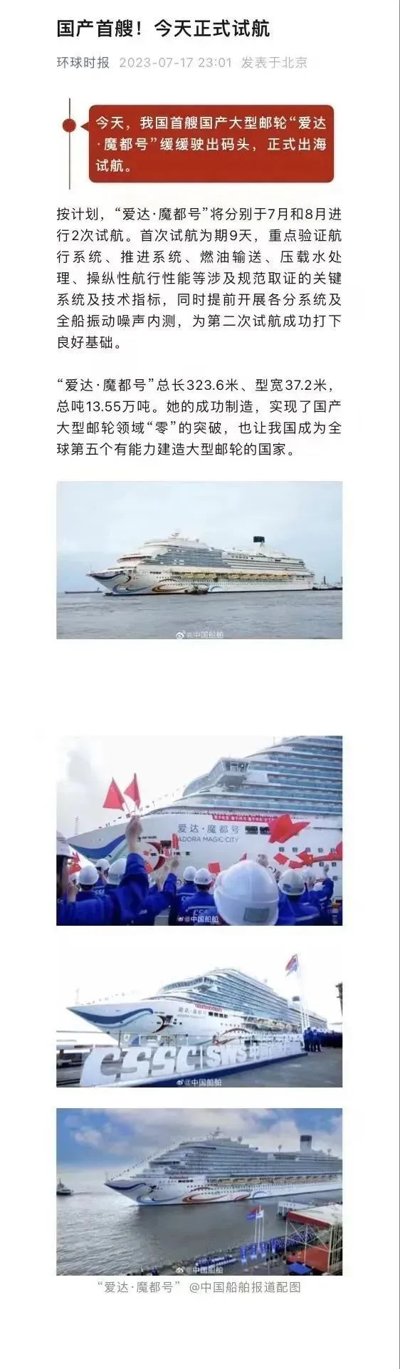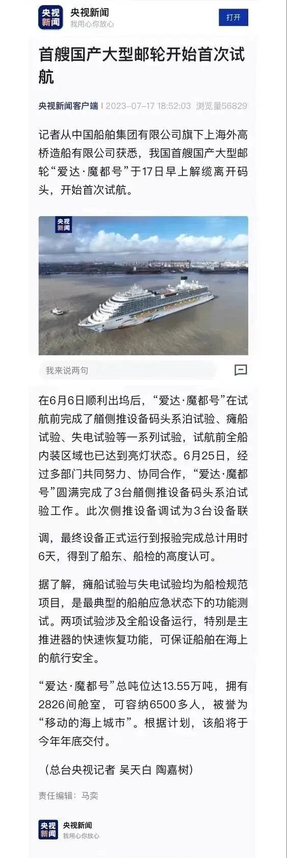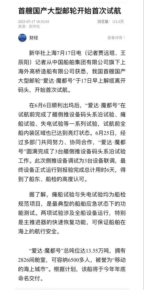 國產(chǎn)首制大型郵輪試航 各大媒體齊齊關(guān)注 ↓↓↓ 人民日報: 新華社: 央視新聞: 環(huán)球時報: 網(wǎng)友齊刷刷舉起小手手: 要上船!要上船! 讓我們一起期待 “愛達·魔都號” 試航凱旋!