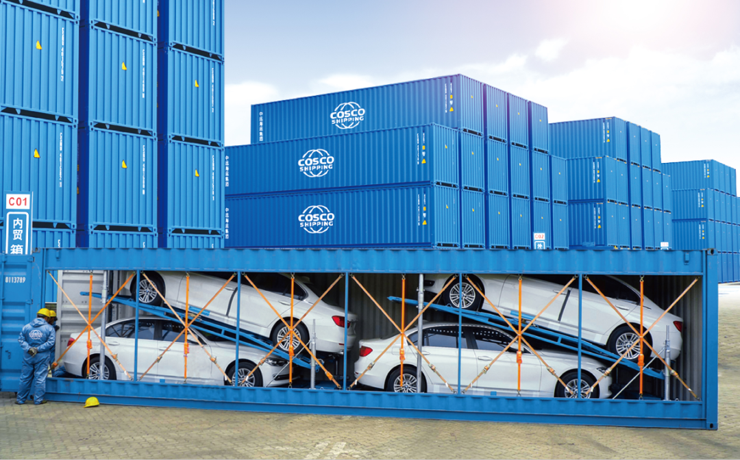 花式運(yùn)輸?shù)牡谝徽惺羌b箱整車(chē)運(yùn)輸。 通過(guò)集裝箱整車(chē)支架技術(shù),可自由選擇將2—4輛汽車(chē)裝入一個(gè)集裝箱內(nèi), 最大程度上節(jié)省平鋪擺放占用面積,可堆疊的三維布局如同為汽車(chē)打造了一幢安如磐石的“海上公寓”。