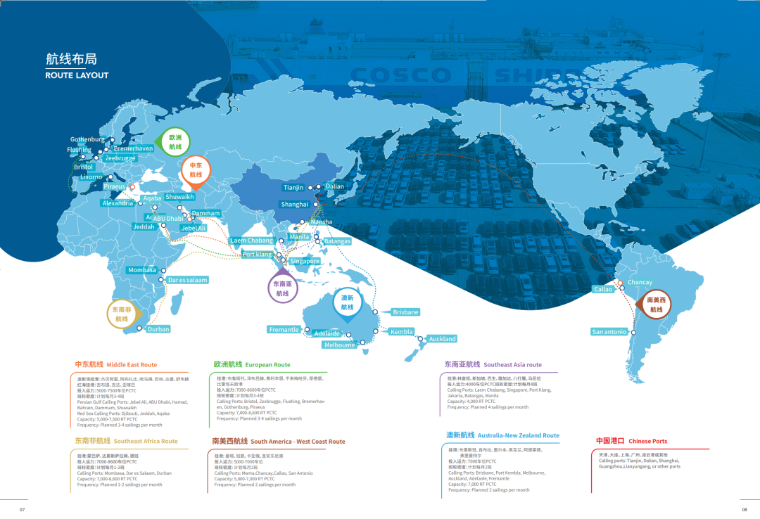 根據(jù)客戶需求,中遠(yuǎn)海運(yùn)協(xié)同船隊(duì)與港口優(yōu)化航線設(shè)置和運(yùn)力配置,靈活調(diào)整全球航線布局,開(kāi)通中東波斯灣、東南亞、歐洲、墨西哥、中南美洲、非洲等班輪航線,為客戶定制商品車(chē)運(yùn)輸整體解決方案,提供多船型、全程端到端物流服務(wù)。