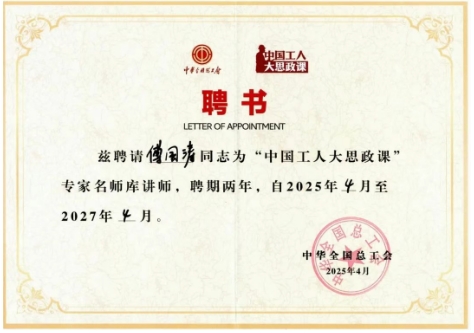 近日,中華全國總工會(huì)正式聘請(qǐng)中船集團(tuán)重慶紅江傅國濤為“中國工人大思政課”專家名師庫講師,聘期兩年。這一聘任旨在推動(dòng)“大思政課”建設(shè)走深走實(shí),發(fā)揮優(yōu)秀人才在思想政治教育中的示范引領(lǐng)作用。