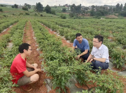 ▲洪術華(右一)在種植基地查看辣椒長勢